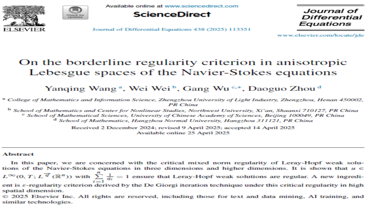 近日,赌博网站 王艳青副教授在数学领域国际知名学术期刊《Journal of Differential Equations》(中科院一区TOP)上发表题为“On the borderline regularity criterion in anisotropic Lebesgue spaces of the Navier-Stokes equations(论Navier-Stokes方程在各向异性Lebesgue空间中的端点型正则性准则)”的研究论文。该成果以郑州轻工业大学为第一署名单位,王艳青为第一作者,与西北大学魏巍副教授、中国科赌博网站大学吴刚副教授、杭州师范大学周道国副教授共同合作完成。
