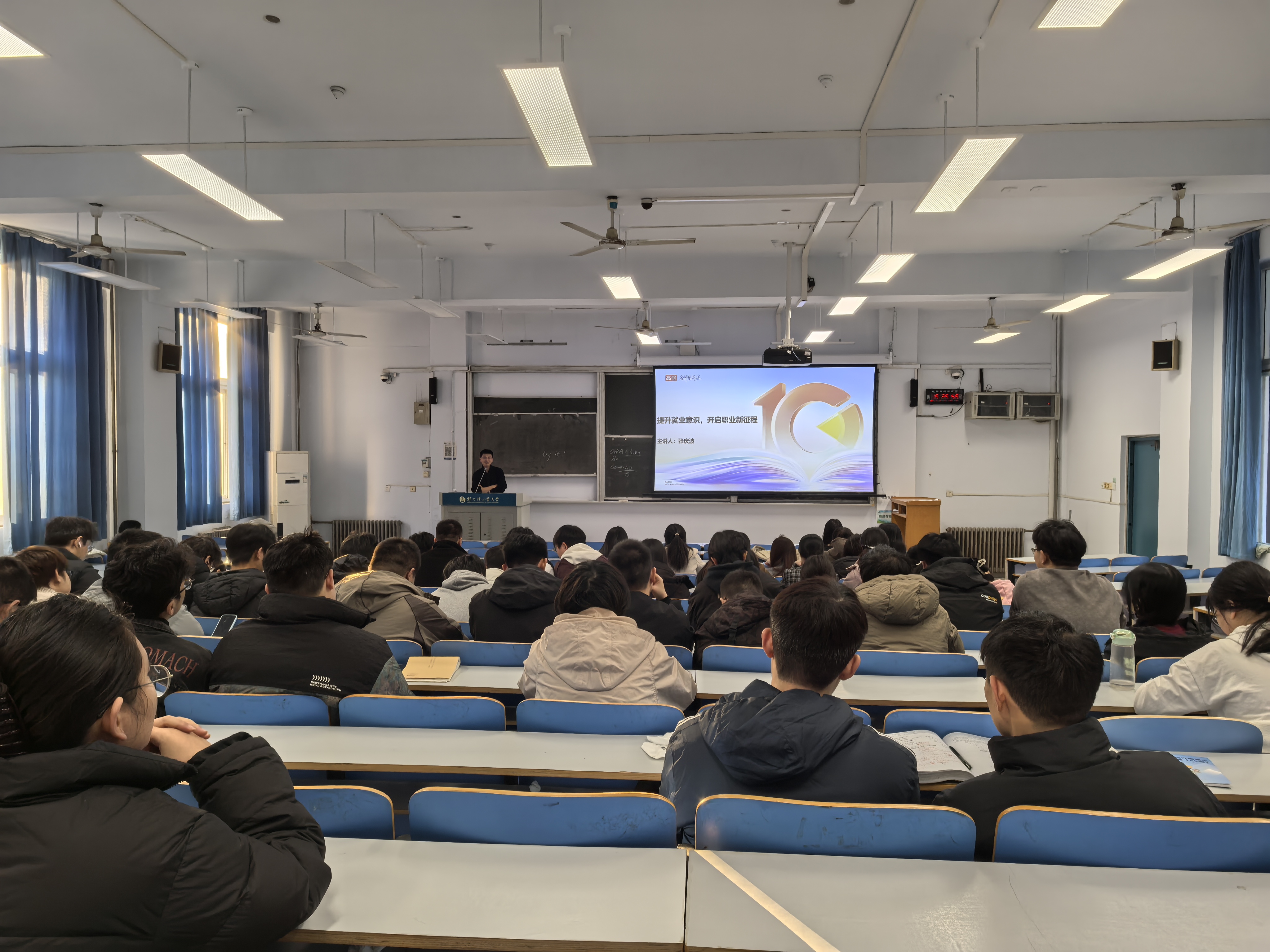 讲座中,张老师围绕精准把握就业趋势、切实端正择业观念、深度聚焦人才培养、科学规划职业生涯、透彻剖析招聘逻辑等核心要点,为同学们展开了一场全面且深入的讲解。他从学校、学生、企业等多维视角出发,精准剖析了当下就业市场所蕴含的机遇与面临的挑战。通过引入鲜活且具有代表性的案例,鼓励同学们要敢于突破传统思维定式,以创新思维引领职业发展方向,凭借坚韧不拔的毅力勇敢迎接创业就业道路上的各种挑战。最后,张老师围绕同学们感兴趣的问题,逐一为同学们进行了解答,互动环节交流深入、气氛热烈。